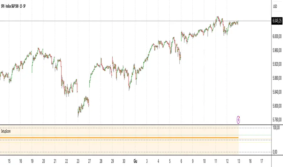 Invece di affidarsi a un solo indicatore, il trader seleziona manualmente quali segnali sono presenti, e lo script calcola un punteggio complessivo percentuale (0–100%), rappresentato come oscillatore in una finestra separata (tipo RSI, MACD, ecc.).