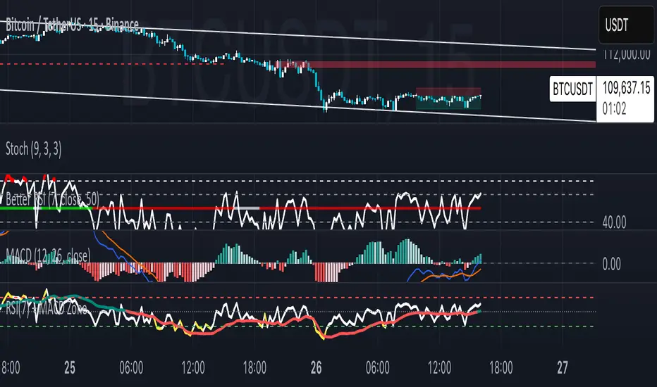 This indicator combines RSI (7) and MACD (12,26,9) into a single panel with a unified scale for easier analysis.