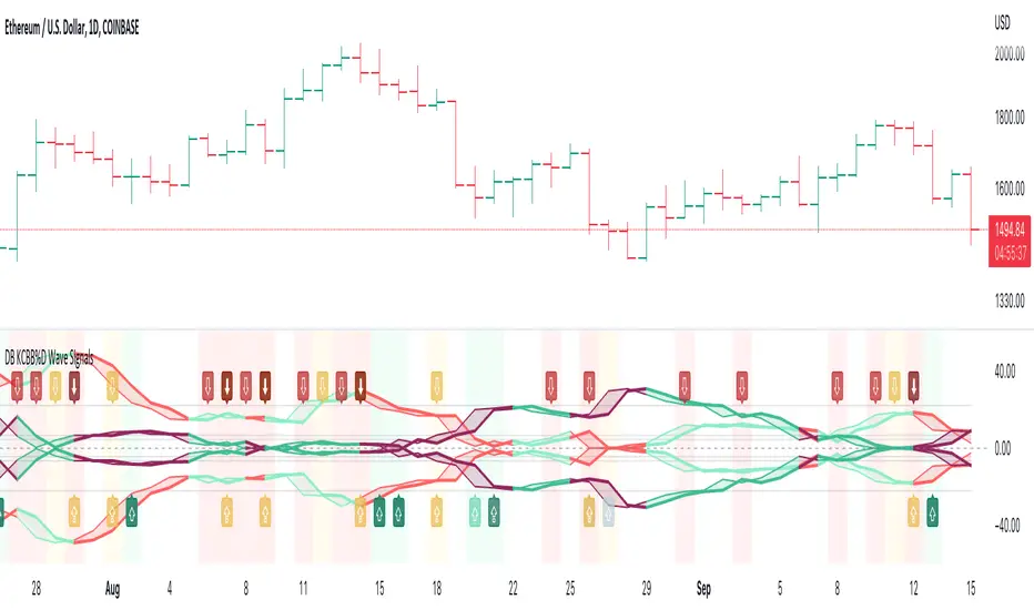 This indicator is a version of my DB KCBB%D indicator updated with signal detection. It results from weeks of analysis of the KCBB%D waves for patterns. I'm releasing it publicly to help those who like the KCBB%D indicator but desire a version with signals built into it.