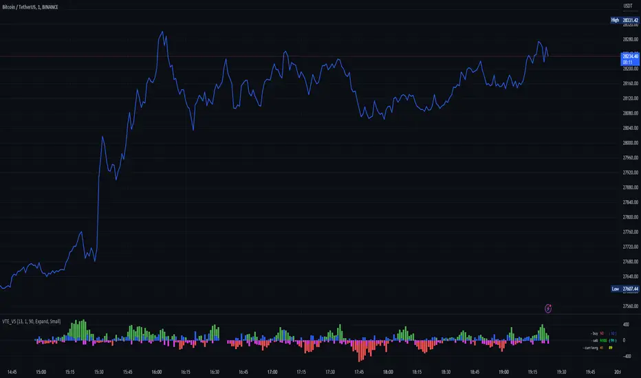 This ticks-based indicator provides real-time volume information for a trading asset. Volume is analyzed and updated continuously, not just at candle close. It is based on DGT's Bull vs Bear Power indicator but adds a gas signal that activates when buying or selling volume percentage reaches a predetermined threshold.