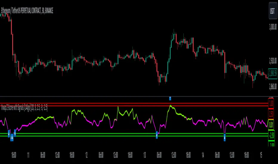 Extreme Z-Score values (both positive and negative) highlight significant deviations from the VWAP, useful for identifying potential reversal points.