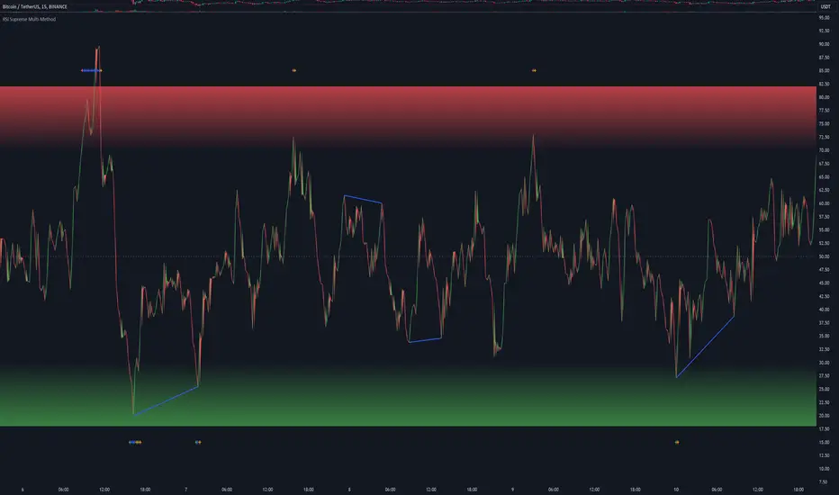 The "RSI Supreme Multi-Method" indicator is a versatile and comprehensive tool that can be used to identify overbought and oversold areas, as well as to spot potential trend reversals through divergences. However, like all technical analysis tools, it should be used in conjunction with other indicators and analysis methods to make well-informed trading decisions.