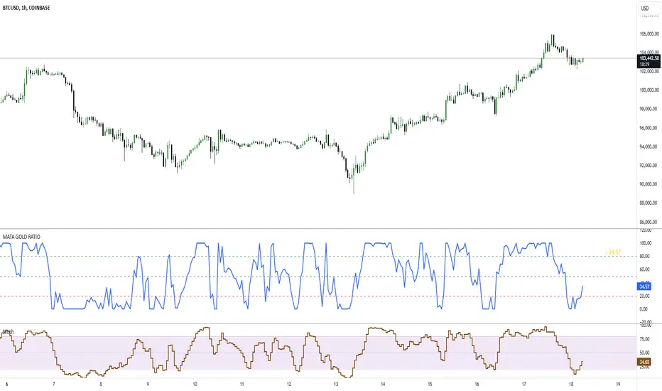 The Instrument to Gold Oscillator is a technical analysis tool that normalizes the ratio of an instrument's price (e.g., BTC/USD) to the price of gold (XAU/USD) into a 0-100 scale. This provides a clear and intuitive way to evaluate the relative performance of an instrument compared to gold over a specified period.