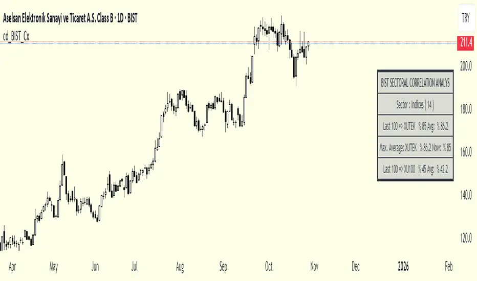 Looking at ASELS from the Electronic Technology sector over the last 30 daily candles, they performed the same movements by 40% with XU100, 73.3% (22/30) with XUTEK (Technology Index), and 86.9% according to the averages.