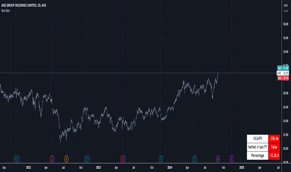 A simple indicator that displayers as a table, telling you whether or not the stock you have selected has a current price that is less than 67% of the company's net current asset value per share (NCAVPS) at its last reporting period (FQ, FY, TTM).