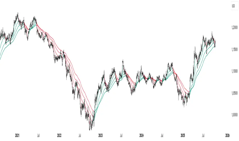 Dynamic Trend Colors: Green for uptrends, red for downtrends, gray for neutral phases.