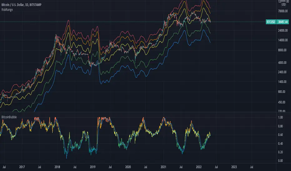 This is an extension of the original 'Bitcoin Bubble' indicator I previously made, but shows the necessary price required to reach a range of bitcoin's bubble level in the short term. I recommend using this metric with a daily timeframe to have an adequate amount of data.