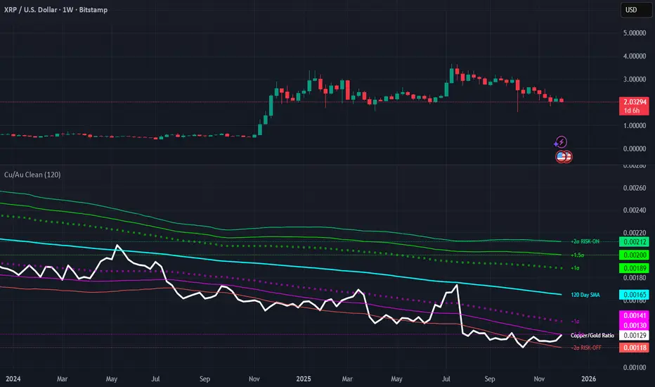 Cu/Au Ratio – LINES + LABELS is a clean, macro-oriented indicator built around the Copper/Gold price ratio — a well-known gauge of economic strength, market sentiment, and shifts between risk-taking and risk-aversion.The script calculates: