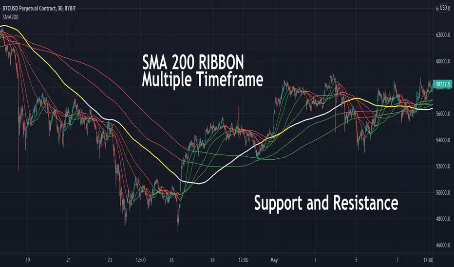 The SMA 200 is one of the most important and strongest support/resistance lines on any timeframe. This script pulls the SMA 200 line from multiple timeframes so traders can visually see price action bounce between support and resistance . The current timeframes SMA 200 is displayed in white and turns yellow to signify "pressure". Can be used on higher timeframes to find bull action. This indicator can also be used to filter out pumps and dumps as shown in example 3 and 4.