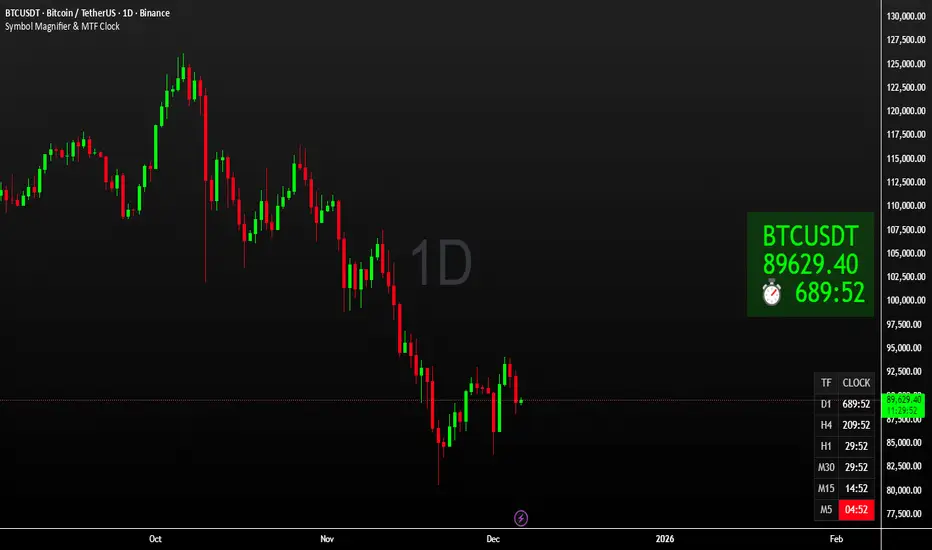 Shows your symbol, price, and countdown timers for multiple timeframes on one chart.