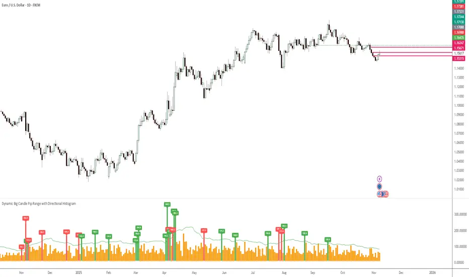 Displays candle ranges in pips as a histogram in a separate pane, highlights big candles exceeding a dynamic threshold, and colors bars and labels green/red based on bullish or bearish direction.”