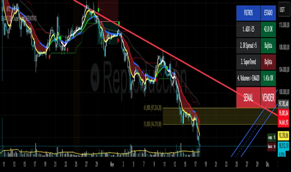 That sounds like a complex and multi-layered trading indicator you've developed! Combining an Exponential Moving Average (EMA) crossover with an Average Directional Index (ADX) filter, a Volume filter, and a Supertrend for overall trend confirmation can certainly help to filter out false signals and potentially increase the reliability of your entry and exit points.Here's a breakdown of the components you're using and why this combination can be powerful:📊 Indicator Components and Their Roles1. 7/21 EMA Crossover (Signal Generator)The $7$-period EMA and $21$-period EMA crossover is a common strategy used to generate initial buy or sell signals.Buy Signal: The short-term EMA (7) crosses above the long-term EMA (21).Sell Signal: The short-term EMA (7) crosses below the long-term EMA (21).2. ADX DI Filter (Momentum and Direction)The Average Directional Index (ADX) and its directional indicators ($+DI$ and $-DI$) are key to confirming the strength and direction of the move.Directional Confirmation: The EMA crossover must be confirmed by the appropriate directional index. For a buy, the $+DI$ should be above the $-DI$. For a sell, the $-DI$ should be above the $+DI$.Trend Strength (