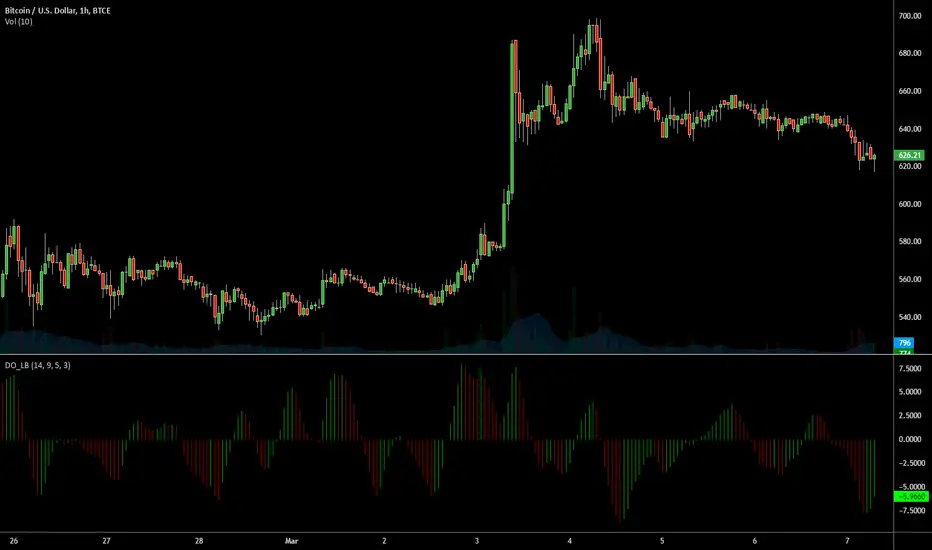 The Derivative Oscillator is calculated as the difference between the smoothed RSI and the signal line and displayed as histogram.