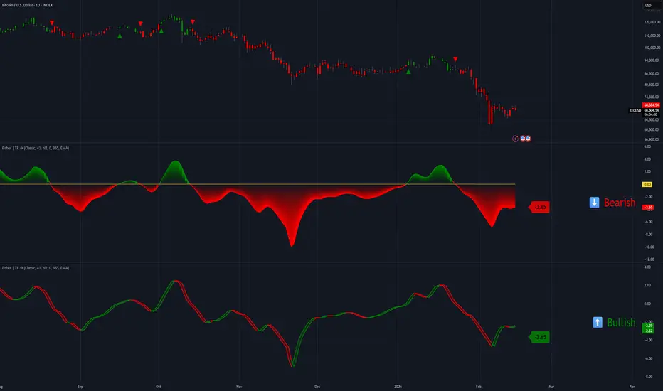 Fisher Transform - Fisher | TR is a sophisticated momentum oscillator that applies the Fisher Transform to normalize price data, creating a Gaussian probability distribution that more clearly identifies price reversals and trend strength. Developed by Tiagorocha1989, this indicator enhances the classic Fisher Transform with dual-mode operation and comprehensive visual customization, making it ideal for traders seeking early reversal signals with reduced lag.