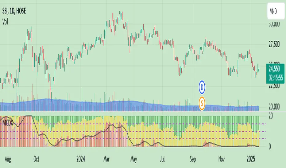 The MCDX indicator (Market Cycle Dynamic Index) is a technical indicator developed by Trung Pham. It is a tool used for analyzing the stock market, often utilized to identify big money flow (Big Money) and evaluate the strength of individual stocks or the overall market.
