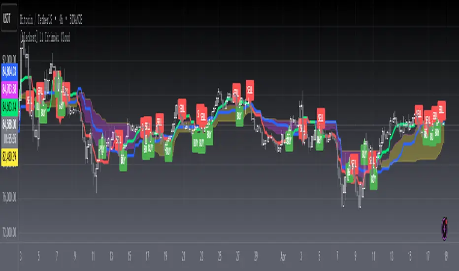OVERVIEWThe **Ichimoku Cloud** indicator by *blackcat* provides a comprehensive view of market trends using multiple moving averages and support/resistance levels. It helps traders identify potential buy and sell signals through visual cues like colored clouds and dynamic lines. The script calculates key components such as the Conversion Line, Base Line, Lagging Span, Leading Span 1, and Leading Span 2, offering insights into trend direction and strength.