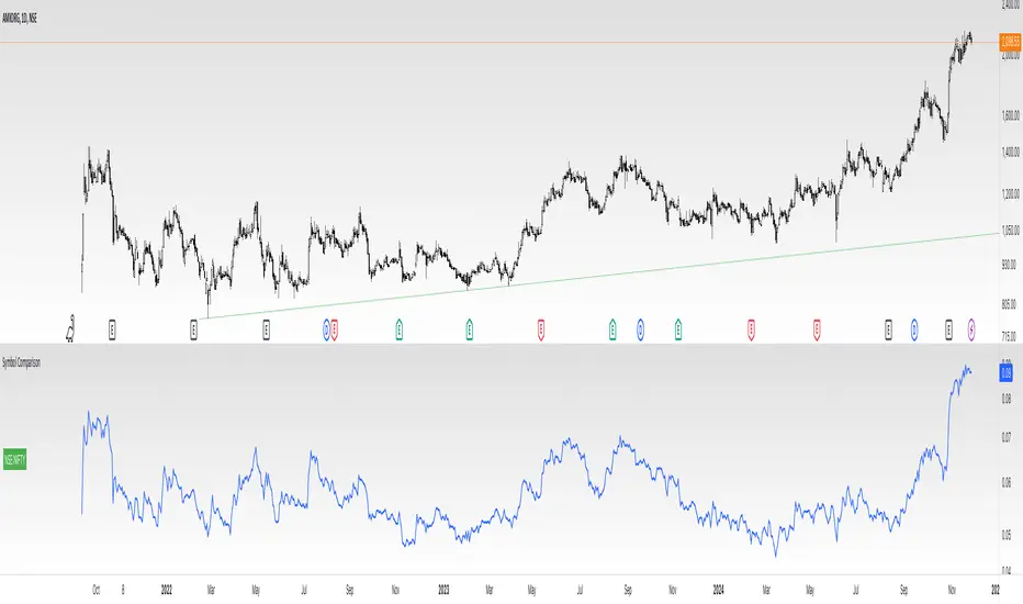 Overview:This indicator simplifies the comparison of a stock's performance against a specified index, such as the Nifty 50. By calculating and plotting the ratio between the two, it provides a clear visual representation of relative strength.