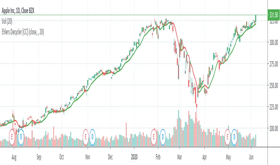 The Decycler was created by John Ehlers (Cycle Analytics For Traders pgs 40-41) and this is a moving average that has an extremely low lag even though it uses a fairly high length to calculate everything. This can also work well as a trendline. Buy when the indicator line is green and sell when it is red.