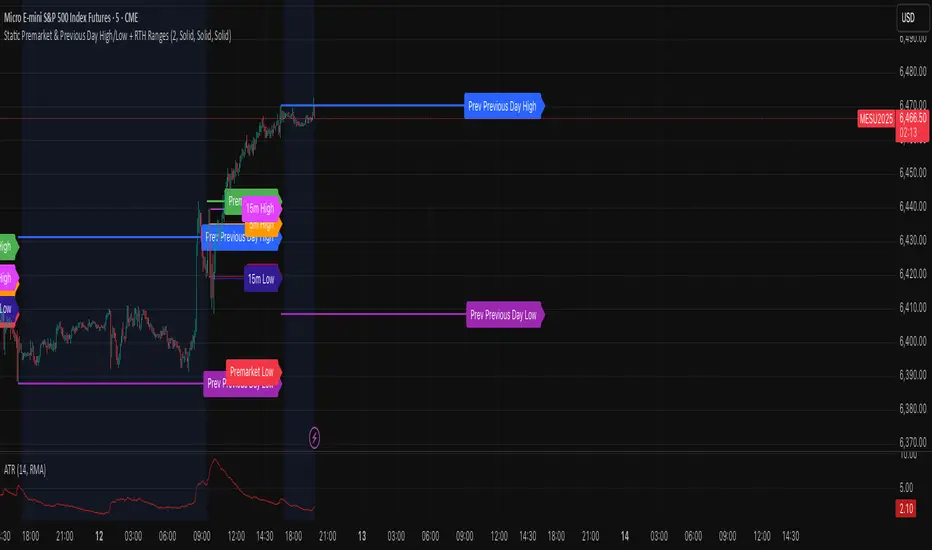 This scripts adds lines for previous day and premarket high/low with labels that you can toggle on and off. The lines extend through current premarket and trading session