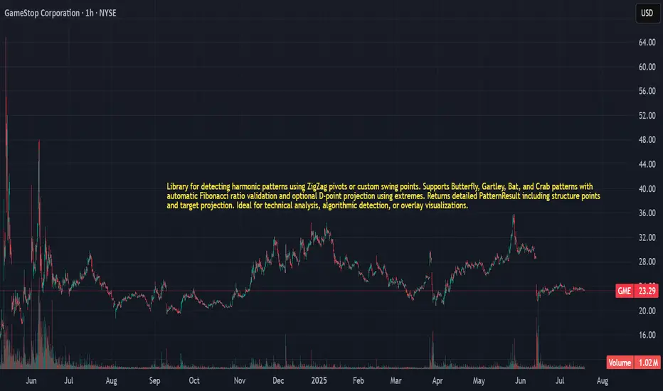 Library for detecting harmonic patterns using ZigZag pivots or custom swing points. Supports Butterfly, Gartley, Bat, and Crab patterns with automatic Fibonacci ratio validation and optional D-point projection using extremes. Returns detailed PatternResult including structure points and target projection. Ideal for technical analysis, algorithmic detection, or overlay visualizations.