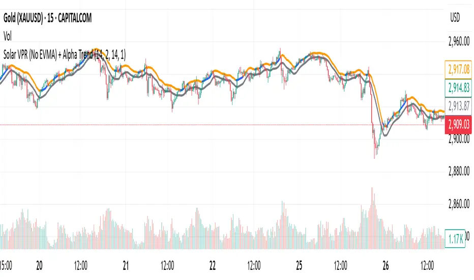 This Pine Script v6 indicator combines Solar VPR (without EVMA slow average) and Alpha Trend to identify potential trading opportunities.