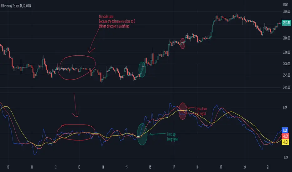 The main goal actually was to indicate the undefined trend zones like when the price is squeezed, the indicator value will be very close to zero (at this zone you should not place any orders)