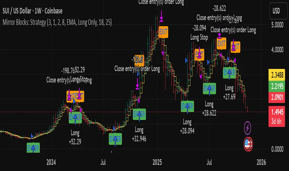 Rather than attempting to “predict” markets, the Mirror Blocks framework visualizes how price behaves when it expands away from, contracts toward, or flips across stacked WMA structures. These mirrored layers form a wave-like block system that highlights transitional zones in a clean, mechanical way.