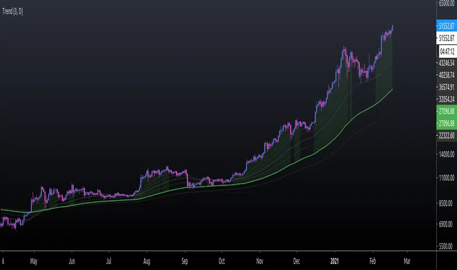 The purpose of this script is to identify price trends based on EMAs. The relative position of price to specific EMAs and the position of certain EMAs towards each other are used to determine the trend direction. The script is intended for investors as a tool to define a basis for further evaluation. I do not use the script as a signal generator and would not recommend doing so without the help of additional indicators.