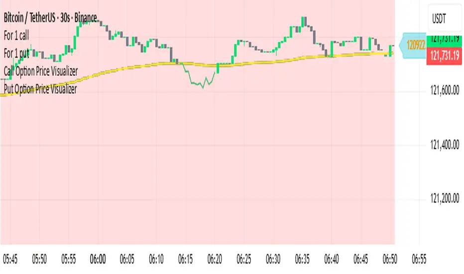 This powerful two-part indicator system provides a streamlined, real-time visualization of both Call and Put option prices for the same strike price, directly on your TradingView chart. It eliminates the need to constantly monitor a separate options chain, allowing traders to see the interplay between call and put premiums and the underlying asset's price action in one integrated view.