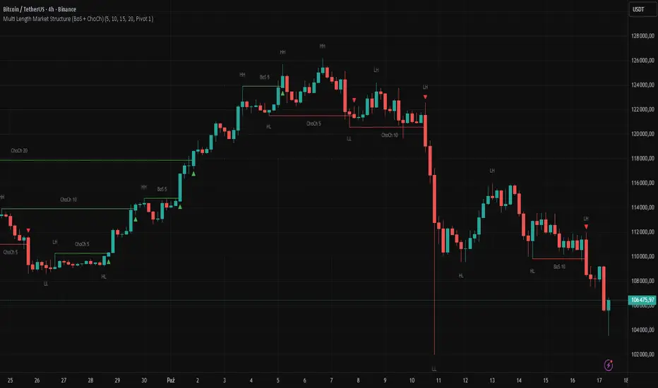 The "Multi Length Market Structure (BoS + ChoCh)" indicator is a technical analysis tool that identifies key pivot points on the chart and signals market structure breaks (Break of Structure - BoS) and changes in market character (Change of Character - ChoCh). It is designed for traders employing market structure-based strategies, enabling the identification of critical support and resistance levels and potential trend reversal points. The indicator offers flexible pivot length settings, customizable colors, and labels, ensuring clarity and precision on the chart.