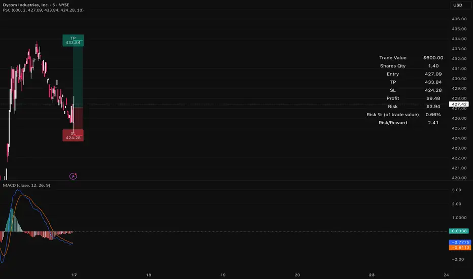 This script calculates trade size, risk, reward, and performance metrics dynamically based on your selected Entry, Take Profit, and Stop Loss levels.