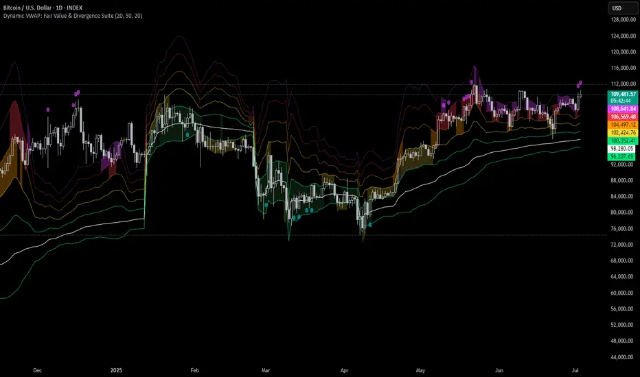 Dynamic VWAP: Fair Value & Divergence Suite is a comprehensive tool for tracking contextual valuation, overextension, and potential reversal signals in trending markets. Unlike traditional VWAP that anchors to the start of a session or a fixed period, this indicator dynamically resets the VWAP anchor to the most recent swing low. This design allows you to monitor how far price has extended from the most recent significant low, helping identify zones of potential profit-taking or reversion.