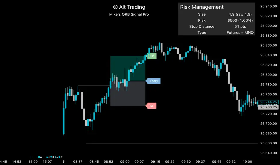 The Alt Trading: Mike's ORB Signal Pro indicator is a professional opening-range breakout system engineered for precision intraday trading on futures and CFD markets. It dynamically calculates the first 15-minute range (9:30–9:45 AM New York time) using 1-minute granularity, then monitors for clean breakout triggers when price closes decisively above or below these critical levels. The system allows only one long and one short setup per session, ensuring disciplined trade selection and eliminating overtrading. Once a valid breakout occurs, the indicator automatically generates visual risk/reward boxes that extend in real time, displaying entry, stop-loss, and take-profit zones with surgical clarity. Integrated money management logic calculates position size dynamically based on account balance, risk per trade, and stop distance, with support for both MNQ futures ($2/point) and CFD contracts with custom point values. The system caps position size to prevent over-leveraging and displays all critical metrics including raw and rounded contract size, risk percentage, and stop distance in a clean top-right table for instant decision-making. Trades automatically close when price hits the target, stop, or session end (4:00 PM by default), snapping all visual elements to the final bar for historical clarity. Optional session-level lines (CDH, CDL, PDH, PDL) provide additional context for confluence-based entries. With fully customizable styling for risk/reward zones, labels, ORB lines, and watermark branding, this indicator delivers a complete, exchange-grade framework for disciplined breakout trading with transparent risk modeling and real-time visual feedback.