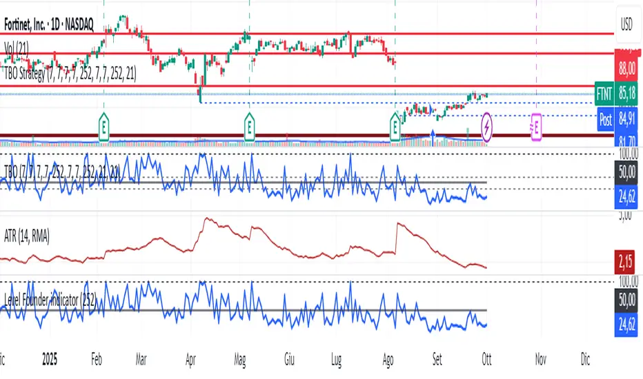 This tool, designed to identify sensitive horizontal levels, aims to simplify the technical reading of charts. This indicator is based on the concept of volatility, understood as the clash between supply and demand, the oscillation of forces on the battlefield until the final price of each candlestick is determined. By capturing the volatility candlestick by candlestick, the indicator calculates it in absolute terms, making it numerically comparable, within a range between 0 and 100. When this value reaches 100, a volatility spike is generated, which identifies a point of focus on an instrument's chart. At these peaks, we observe where the battle between buyers and sellers has concluded, that is, where supply and demand have met to define a price: the candlestick's close. At this price, therefore, a definite agreement between supply and demand occurs after a period of volatile trading, certifying what is a "hard-earned" price level for a given underlying asset. This threshold translates into a sensitive horizontal level, which in the future (given the market's memory of past clashes) could act as support or resistance, depending on the situation. In short, a horizontal line is drawn at the candlestick closes that share a peak on the "Level Founder Indicator." It works on any timeframe and underlying asset.