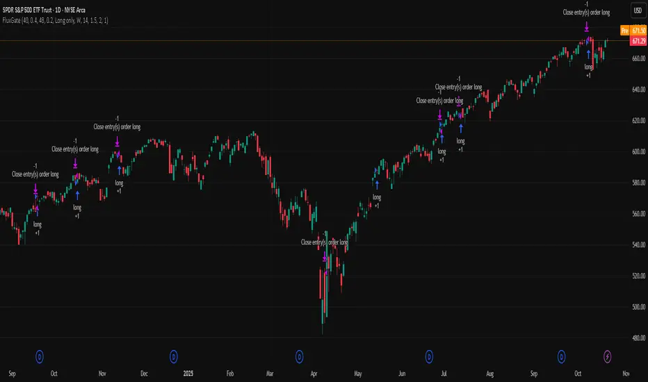 FluxGate treats long and short as different ecosystems. It runs two independent engines so the long side can be bold when the tape rewards upside persistence while the short side can stay selective when downside is messy. The core reads three directional drivers from price geometry then removes overlap before gating with clean path checks. The complementary risk module anchors stop distance to a higher timeframe ATR so a unit means the same thing on SPY and BTC. It can add take profit breakeven and an ATR trail that only activates after the trade earns it. If a stop is hit the strategy can re enter in the same direction on the next bar with a daily retry cap that you control. Add it to a clean chart. Use defaults to see the intended behavior. For conservative workflows evaluate on bar close.