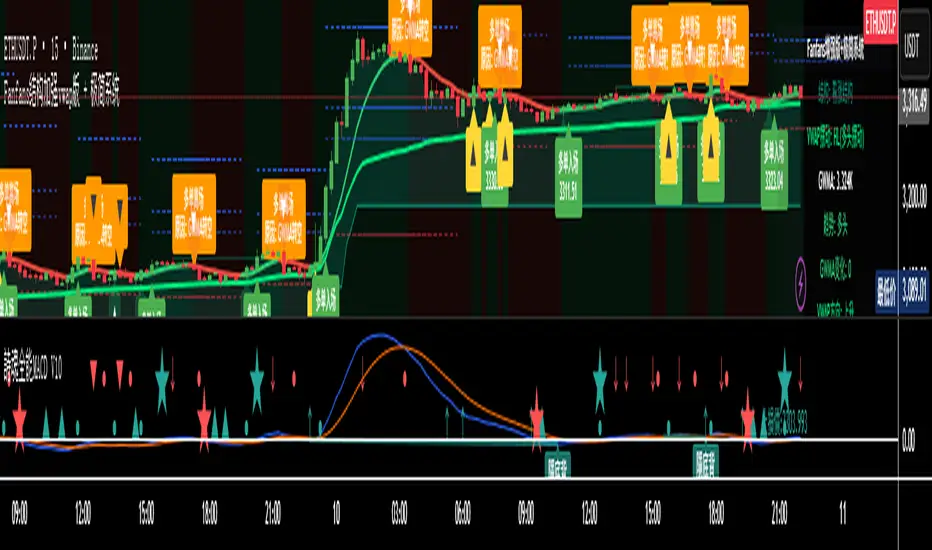 中文:该指标整合Fanfans结构、动态摆动VWAP、高斯GWMA、MACD及极简交易系统,支持趋势过滤(可选GWMA/VWAP/结构维度)、多离场模式(ATR止盈止损/GWMA离场/混合)与移动止损。具备多空信号标注、止损止盈线绘制、多维度共振警报,图表信息面板实时展示结构/VWAP/GWMA/MACD状态,可自定义过滤规则、显示样式及交易参数,适配短周期交易,兼顾趋势判断与信号执行的灵活性。