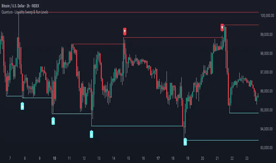 “Quantura – Liquidity Sweep & Run Levels” is a structural price-action indicator designed to automatically detect swing-based liquidity zones and visualize potential sweep and run events. It helps traders identify areas where liquidity has likely been taken (sweep) or released (run), improving precision in market structure analysis and timing of entries or exits.