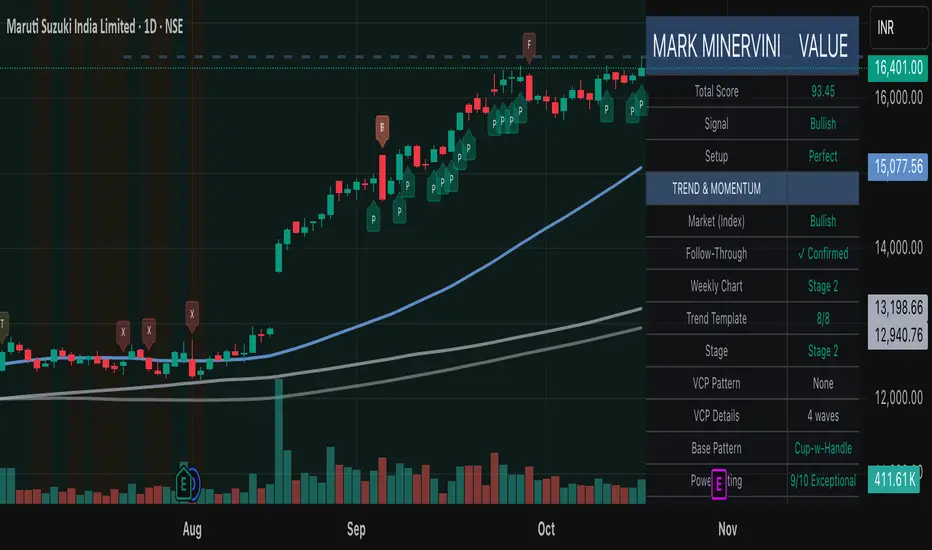 This Pine Script distills Mark Minervini’s SEPA methodology into an institutional‑grade toolkit. It scores every bar against the 8‑point Trend Template, Weinstein stage, VCP dynamics, market health, weekly alignment, relative strength, and accumulation, then surfaces only the setups Minervini actually trades. The dashboard table (dark/light themes) summarizes compliance with each checklist item, portfolio heat, risk metrics, sector leadership, and market status, while on-chart markers with hover tooltips highlight perfect breakouts, VCPs, cheat entries, follow-through days, and exit triggers (stop, trailing MA, distribution, failed breakout). Advanced modules include sector rotation gating, follow-through-day logic, VCP structural tests (upper-third action, prior advance, volume dry-up), weekly confirmation, risk-based position sizing, and portfolio heat controls—making this a turn-key “trade like a champion” assistant ready for desk use or signal automation.