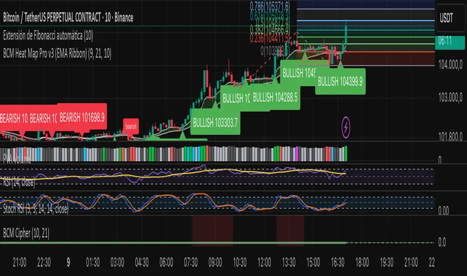 It combines a dynamic EMA Ribbon with optional RSI filtering and confirmation logic to reduce false signals, offering a clean, reliable read of market structure and momentum shifts.