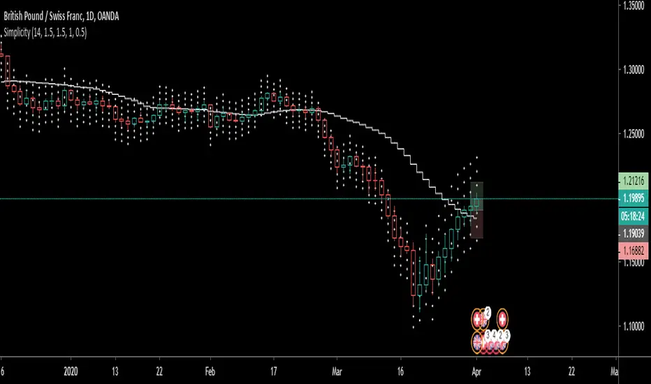 A simple all in one indicator. Combines a simple moving average with an ATR-based money management system. Simply buy when a candle closes above the MA, and sell when it closes below. Set first TP at 1ATR and initial SL at 1.5-1ATR. When price hits 1st TP, exit half of your position. Use the MA to trail your stop on the other half of the position.