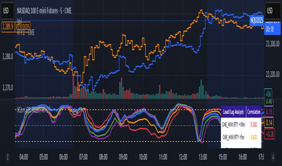 This indicator analyzes the lead/lag relationship between any two financial instruments using rolling cross-correlation at multiple time offsets. Perfect for pairs trading, market timing, and understanding inter-market relationships.