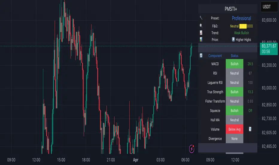 "Professional MSTI+ Trading Indicator" is a comprehensive technical analysis tool that combines over 20 indicators to generate high-quality trading signals and assess market sentiment. The script integrates standard indicators (MACD, RSI, Bollinger Bands, Stochastic, Simple Moving Averages, and Volume Analysis) with advanced components (Squeeze Momentum, Fisher Transform, True Strength Index, Heikin-Ashi, Laguerre RSI, Hull MA) and further includes metrics such as ADX, Chaikin Money Flow, Williams %R, VWAP, and EMA for in-depth market analysis.
