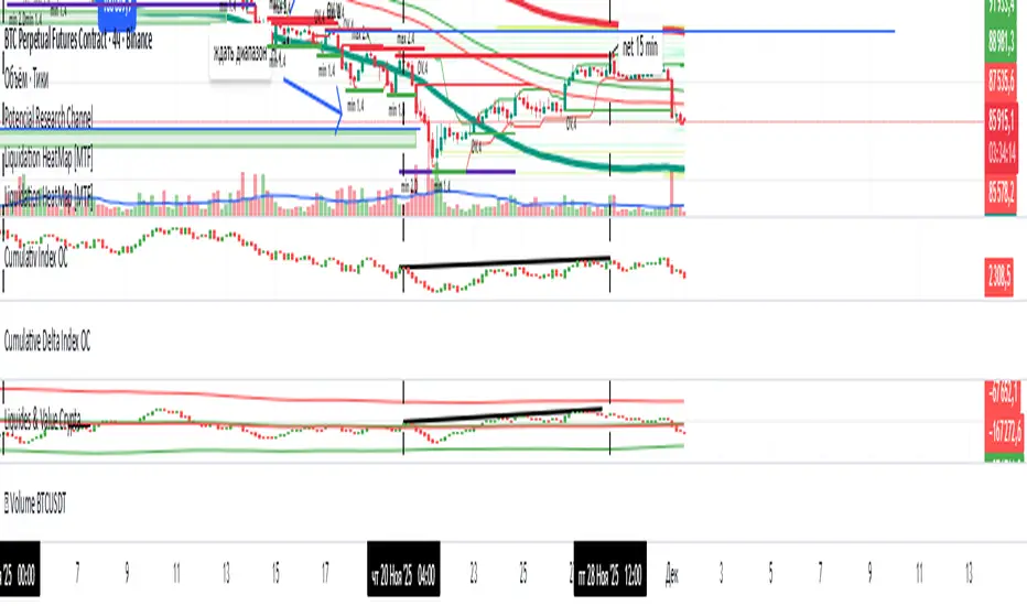 This allows one to determine the dynamics of liquidity movement toward the market; for example, if the price rises and the indicator falls, it means that most market participants are using this rise to exit positions.