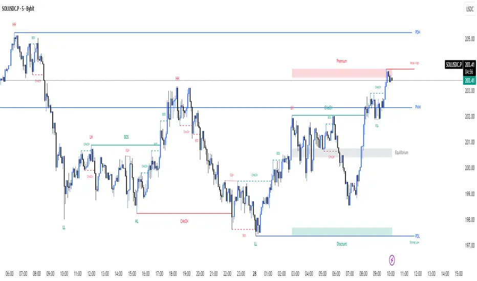 This professional-grade indicator defines and visualizes the core architecture of price — the true Market Structure Framework. It automatically identifies Breaks of Structure (BOS), Changes of Character (CHoCH), and Equal Highs/Lows, while dynamically outlining Swing Legs, Internal Structures, and Premium/Discount Zones with institutional accuracy.