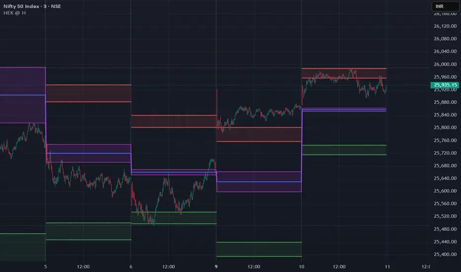 HEK @ H is a custom intraday trading indicator designed primarily for 3-minute timeframe charts. It combines two key zones — the HEK zones (consisting of a Green zone and a Red zone) and the CPR (Central Pivot Range) — to identify high-probability reversal and breakout setups. Both HEK zones and CPR act as dynamic support and resistance areas.