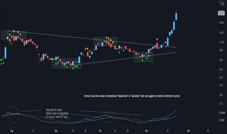 This script is intended to help the viewer identify potential turning points with momentum "headwinds" or "tailwinds" with a visual que at the bar level. The presence of arrows indicates that the TSI indicator is either "curling" up under the signal line, or "curling" down over the signal line. This can help to anticipate reversals, or moves in favor of trend direction.