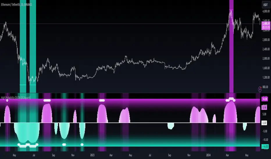 The DCAquant - High Probability OS/OB Pine Script is a sophisticated indicator that provides insights into overbought (OB) and oversold (OS) conditions based on Hull Moving Averages (HMA) and Volume Weighted Moving Averages (VWMA). Here's a detailed breakdown of its functionality: