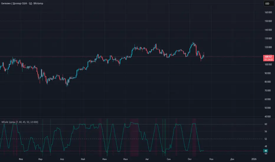 Glassnode Whale Oscillator: tracks BTC accumulation/distribution by whales. Normalized (0-100) based on WSPC (±50k BTC), smoothed SMA. Signals: >60 – bullish (buy), <40 – bearish (sell).