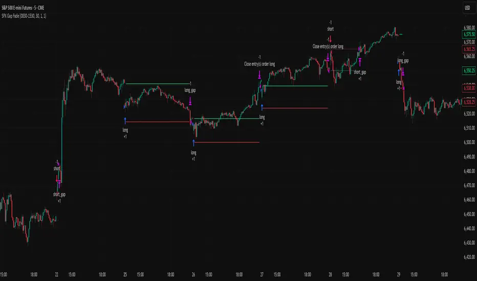 SPX Session Gap Fade is an intraday gap fade strategy for index futures, designed around regular cash sessions on five minute charts. It helps you participate only when there is a full overnight or pre session gap and a valid intraday session window, instead of trading every open. The original part is the gap distance engine which anchors both stop and optional target to the previous session reference close at a configurable flat time, so every trade’s risk scales with the actual gap size rather than a fixed tick stop.
