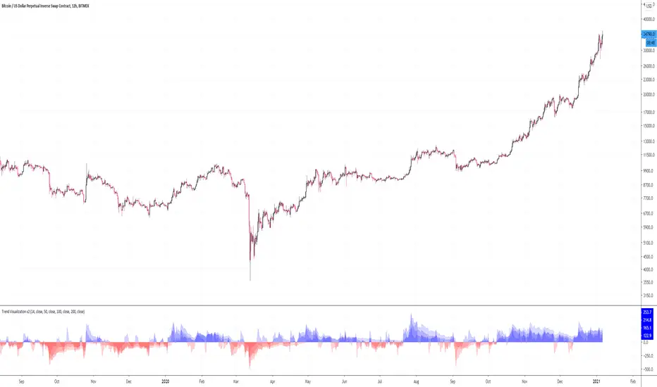 A trend strength indicator for visualizing momentum. Built from 5 different CCI periods and their averages.